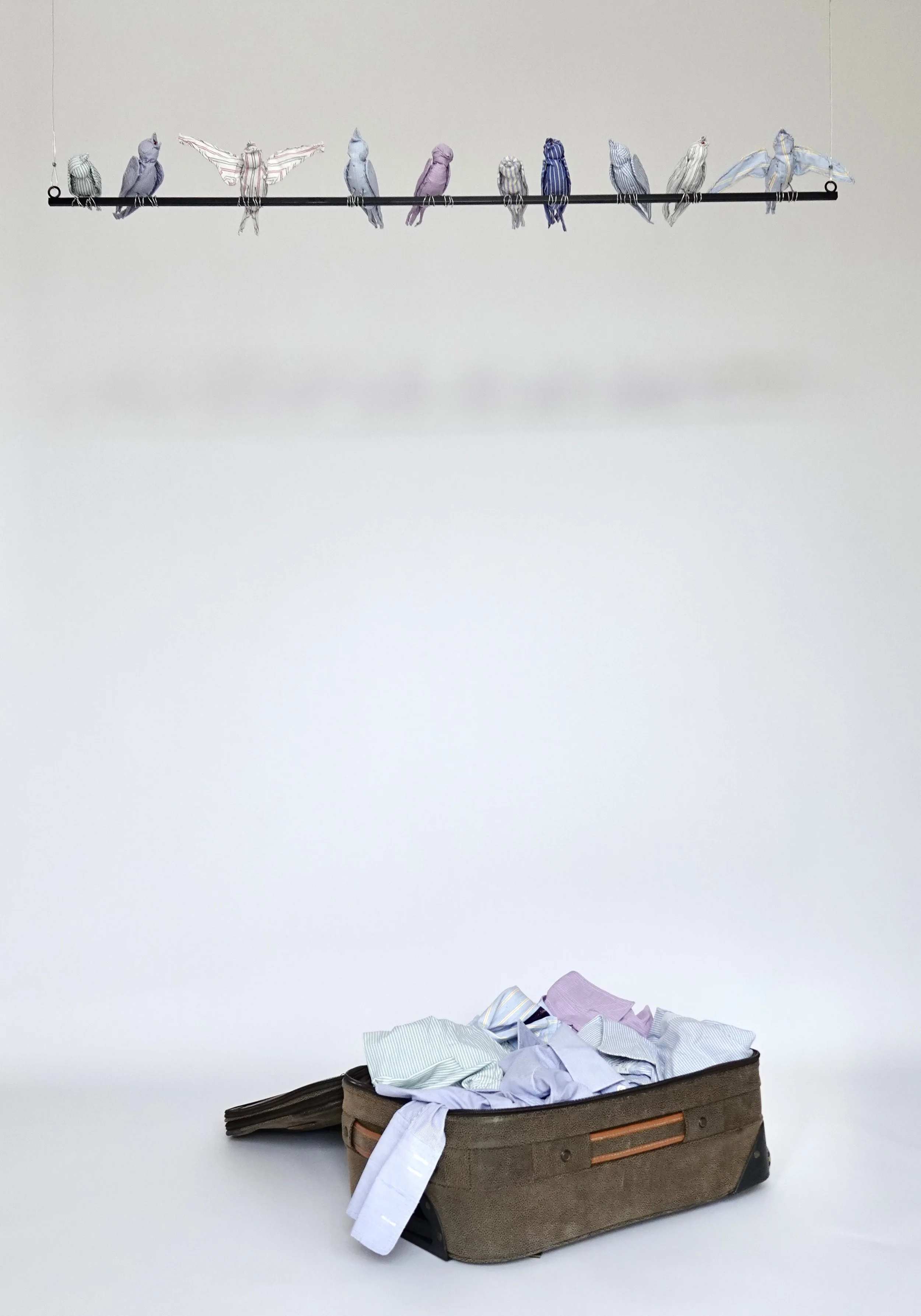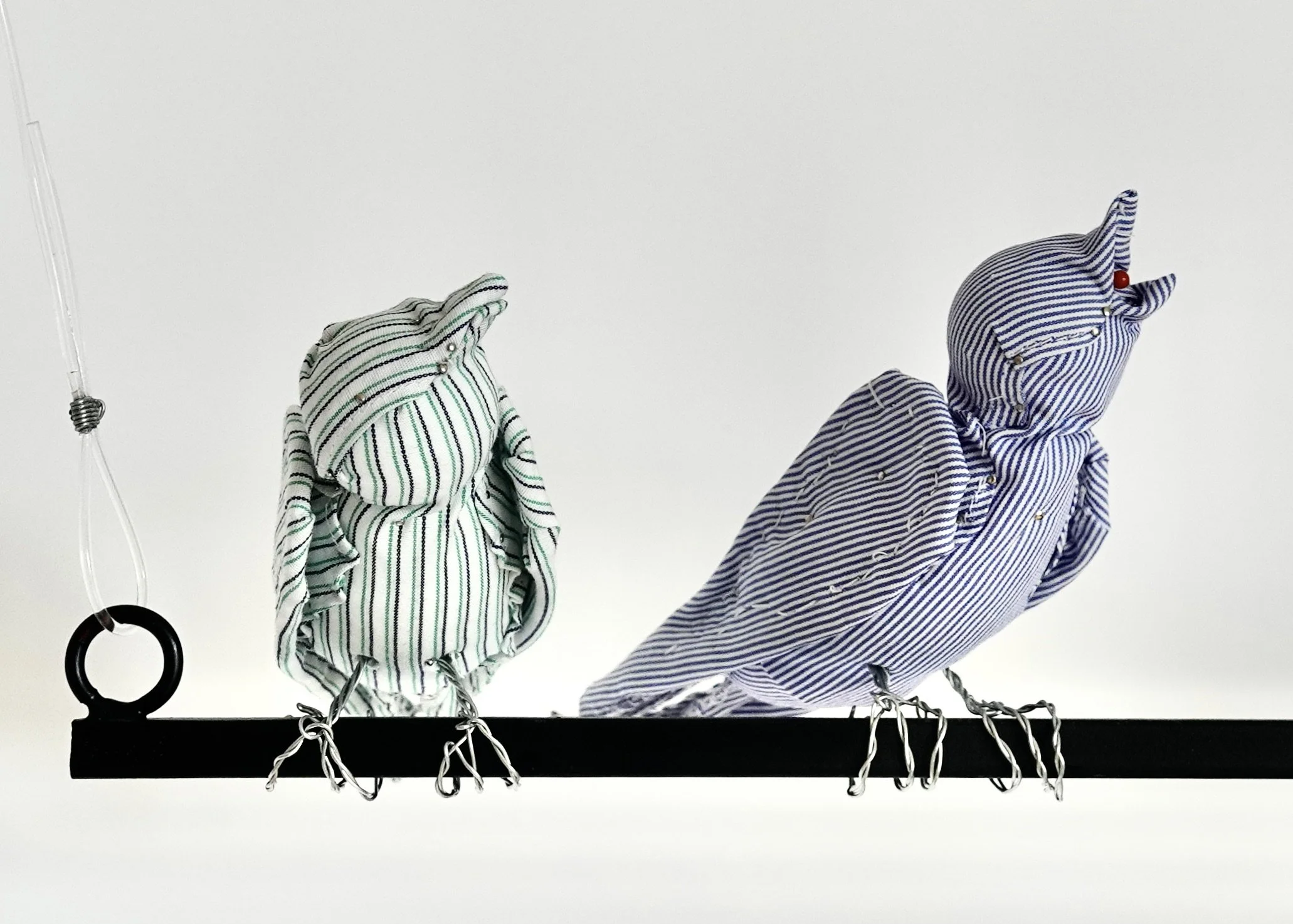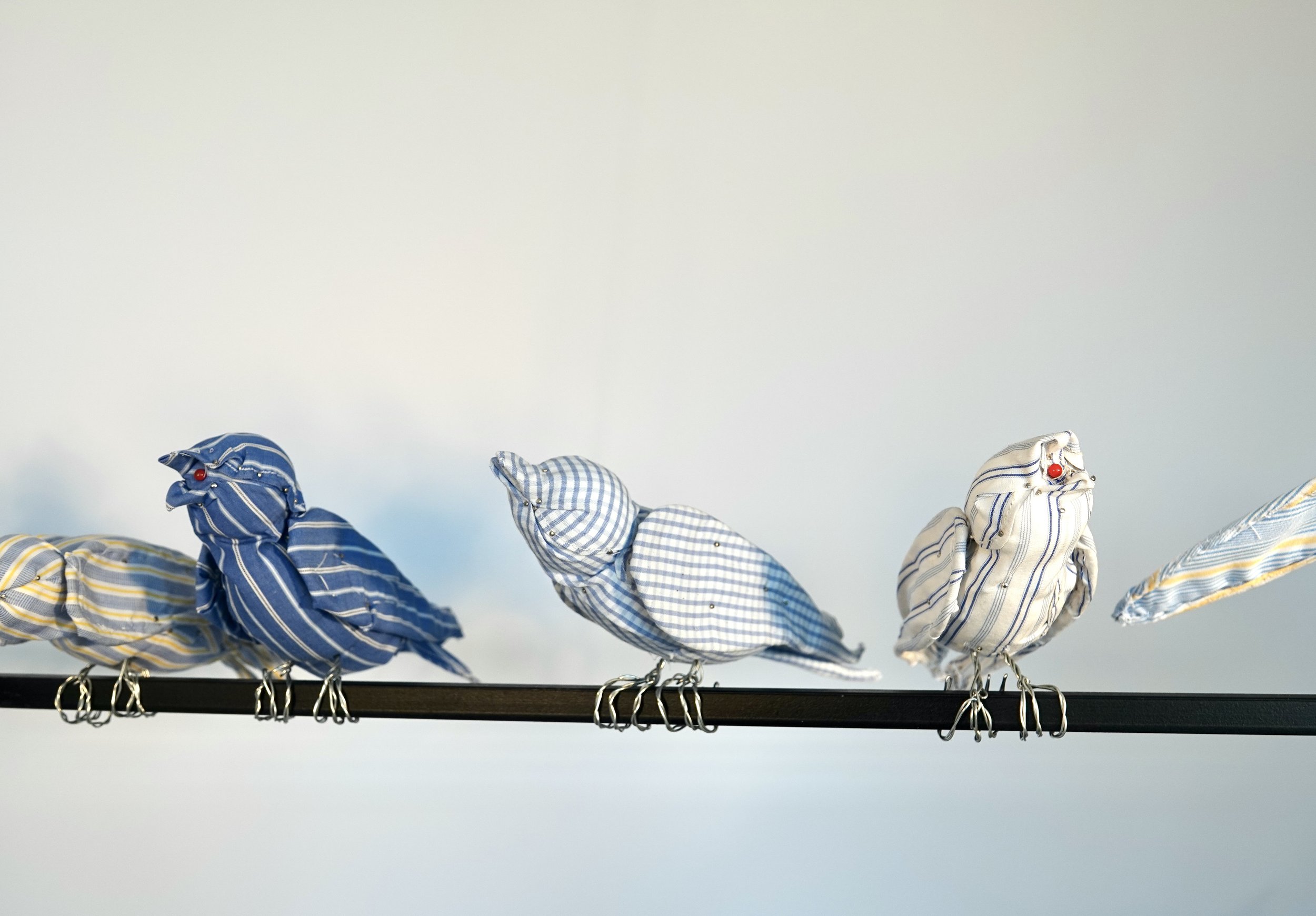 Made from shirts left behind on Great Western Railways trains. Swallows, long distance travellers, sit on a line. Line being boundary, length, crossing.