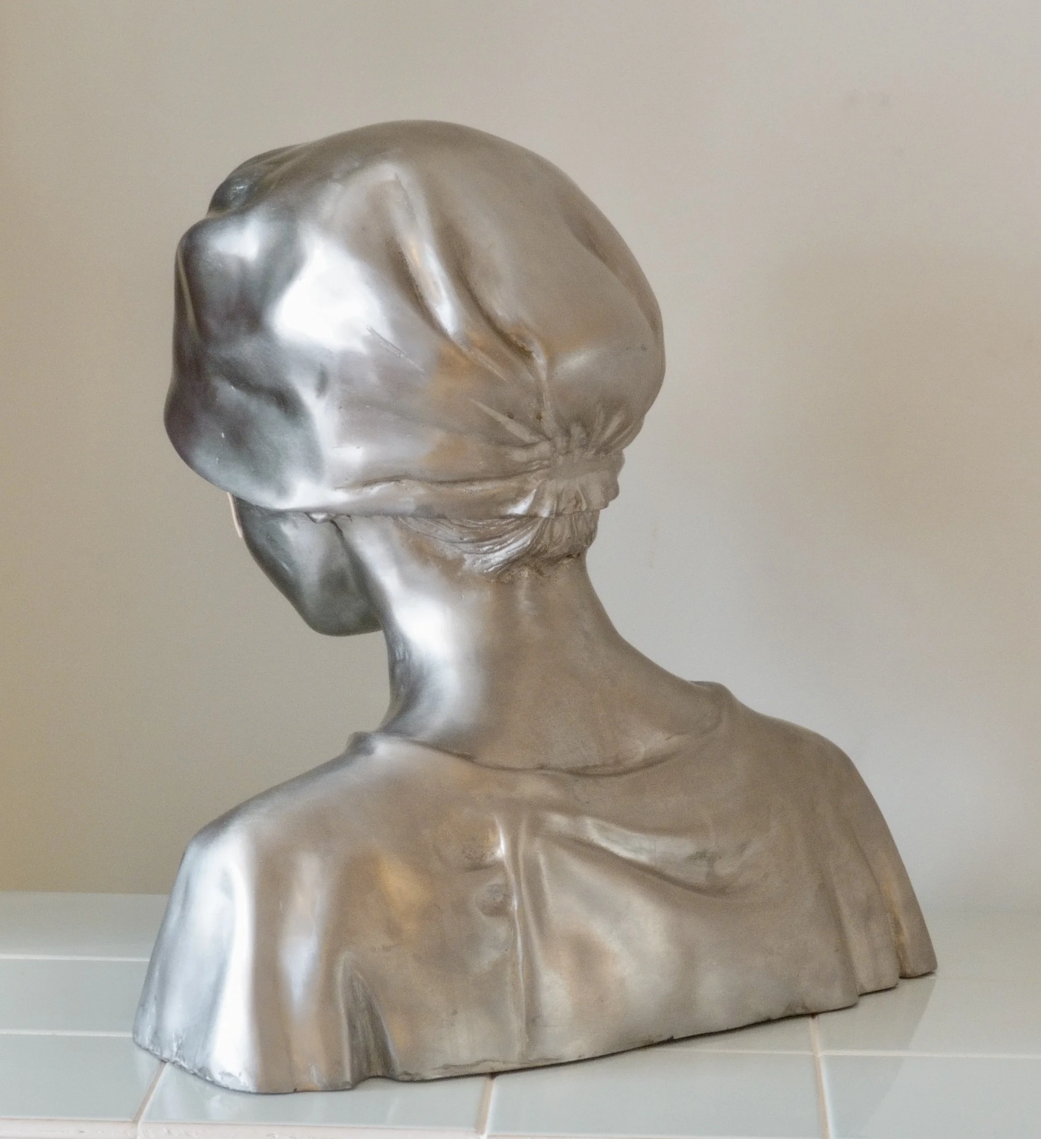 In steel, the patient’s hair cap looks like a helmet. There’s a bravery to motherhood, along with all the love and beauty.